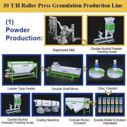 The 30 TPH double roller granulation production line includes a Raymond mill for grinding hard materials, belt conveyors for material transportation and return, double bucket packing scales for packaging, a loader type feeder and a disc feeder for feeding materials, double roller press granulators for pellet formation, screen machines for separating granules and a mixer for mixing raw materials. ນອກຈາກນັ້ນ, it includes a large three-pass splitting for material distribution, a batching machine with 4 bins and a stacking machine for warehousing finished products. All in all, each machine plays a vital role in ensuring efficient and smooth production.