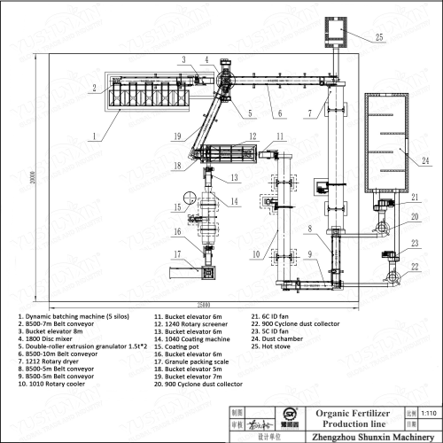【Equipment】Dynamic batching machine, bucket elevator, disc mixer, double roller extrusion, rotary dryer, rotary cooler, screening machine, coating machine, packing scale, cyclone dust collector, air fan, dust chamber, and hot air furnace.